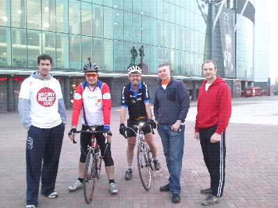 We made it, all safe and sound at 12.45 or so. A total of about 68 hours on the go, a combined core team total of maybe 30 hours sleep in 3 nights between the 5 of us, never more than 2 hours at a time to complete the 775 or so miles. One iphone and a saddle as casualties, no proper meals but lots of energy drinks, bananas, malt loaf, and a couple of fried breakfasts.